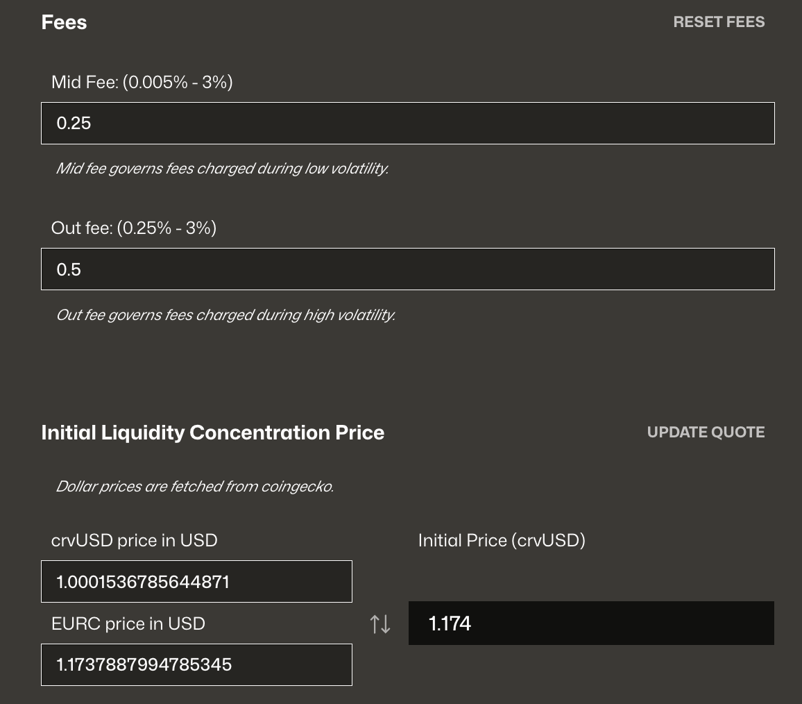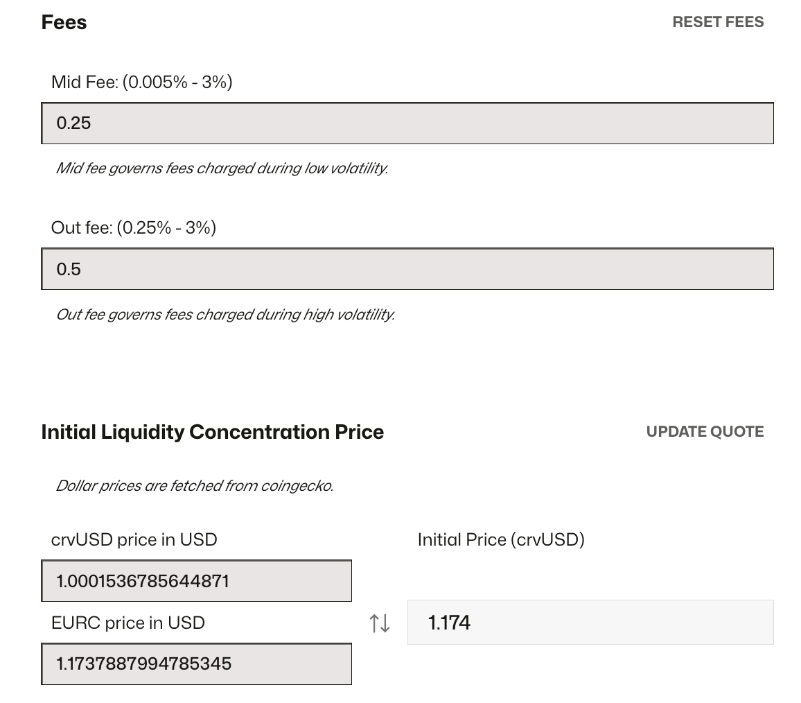 | Mid Fee / Out Fee | The base and maximum fee range, charged depending on pool imbalance. More here: FXSwap Dynamic Fees. |