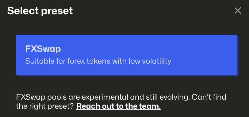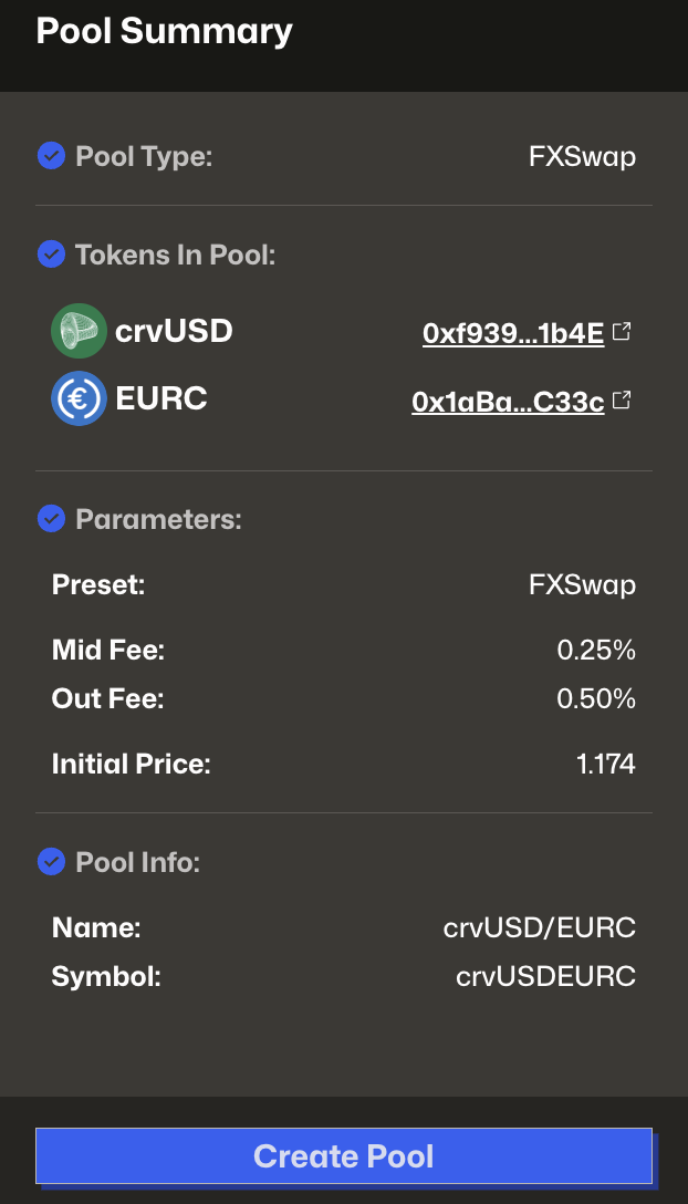 FXSwap pools are appropriate for two uncorrelated but low-volatility assets β such as Forex pairs like crvUSD/EURC or other stable foreign exchange pairs. The creation wizard will guide you through the process, but if you have questions at any point, feel free to reach out to the Curve team in the Telegram or Discord.