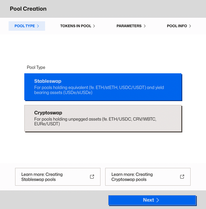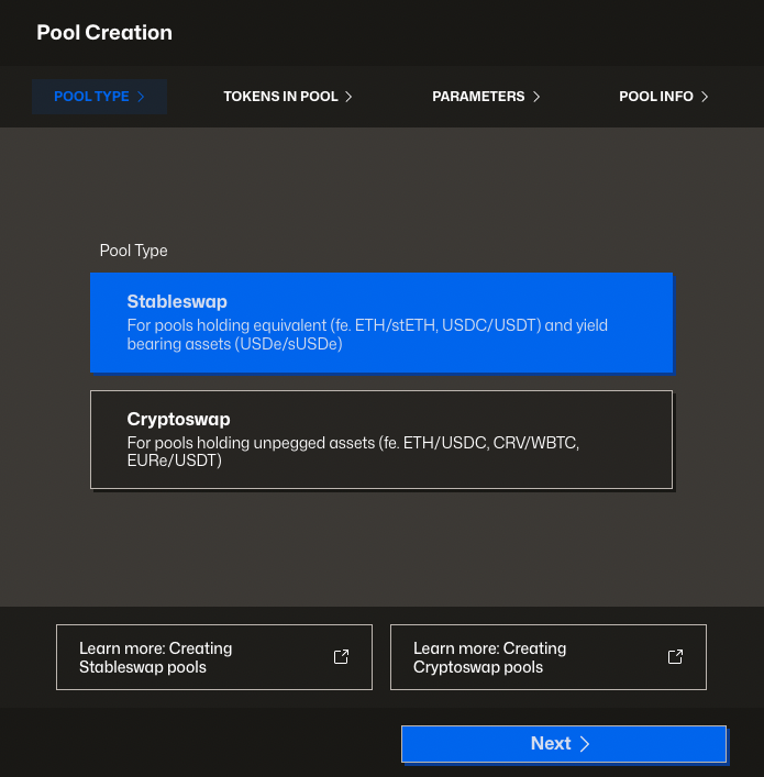The Stableswap pool creation is appropriate for assets expected to hold a price peg very close to each other, like a pair of dollarcoins. The creation wizard will guide you through the process of creating a pool, but if you have questions throughout you are encouraged to speak with a member of the Curve team in the Telegram or Discord.