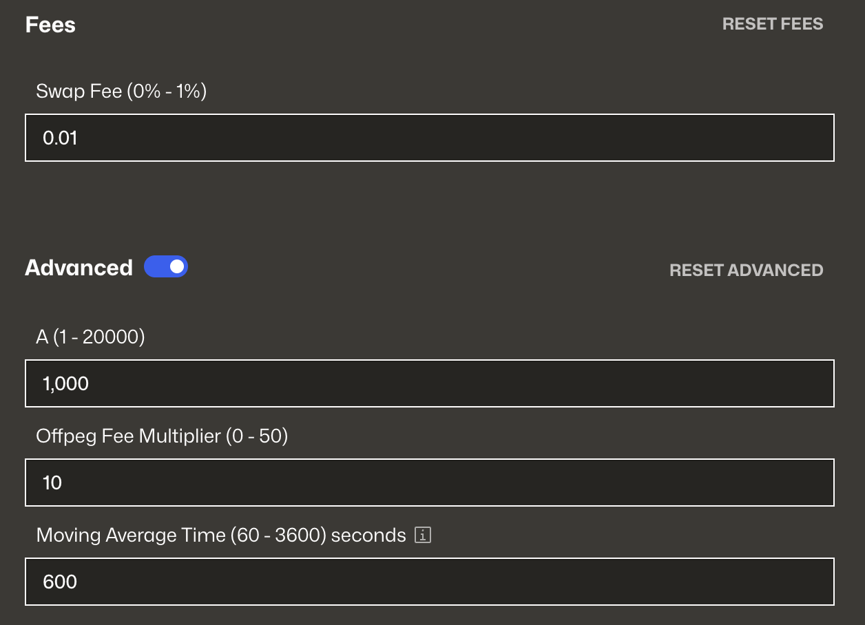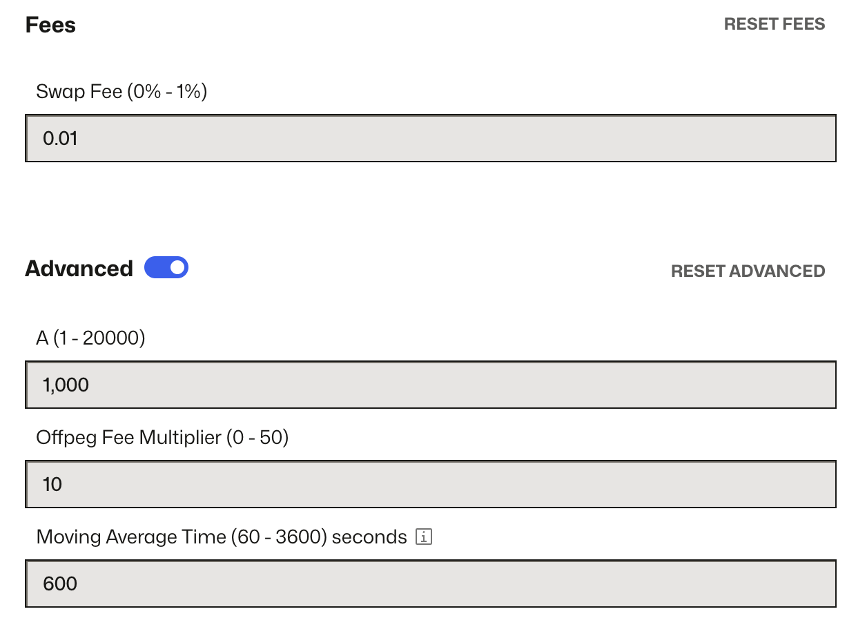 | Off-peg Fee Multiplier | 0 to 12.5 | Dynamically increases the fee when the pool becomes imbalanced. More here: Offpeg Fee Multipler |