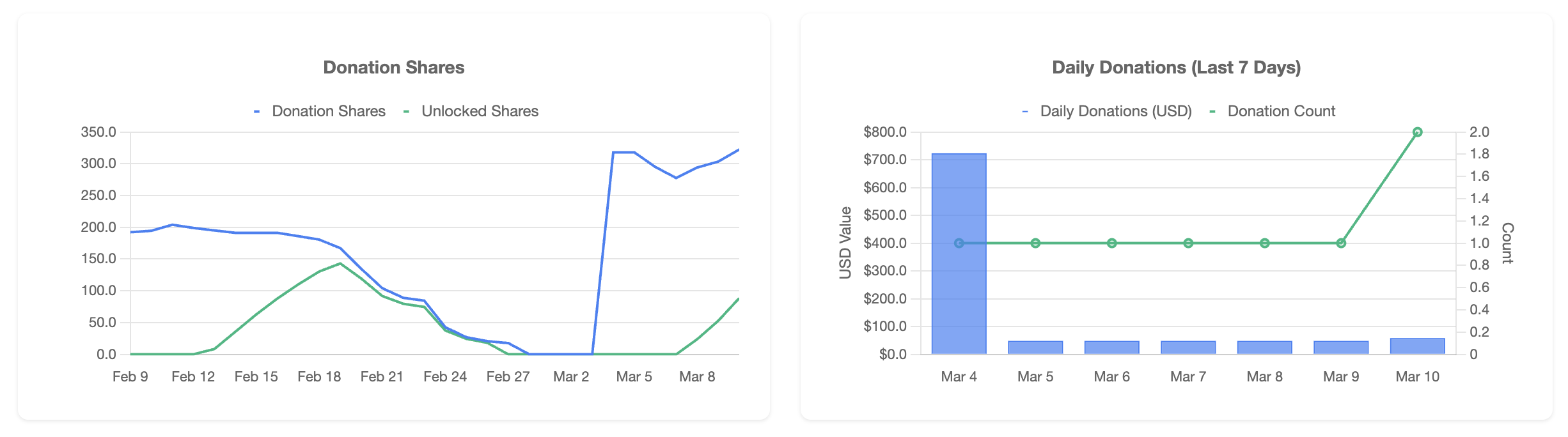 The dashboard shows Donation Shares (total refuel buffer) vs Unlocked Shares (how much has been consumed by rebalancing), as well as Daily Donations in USD over the last 7 days.