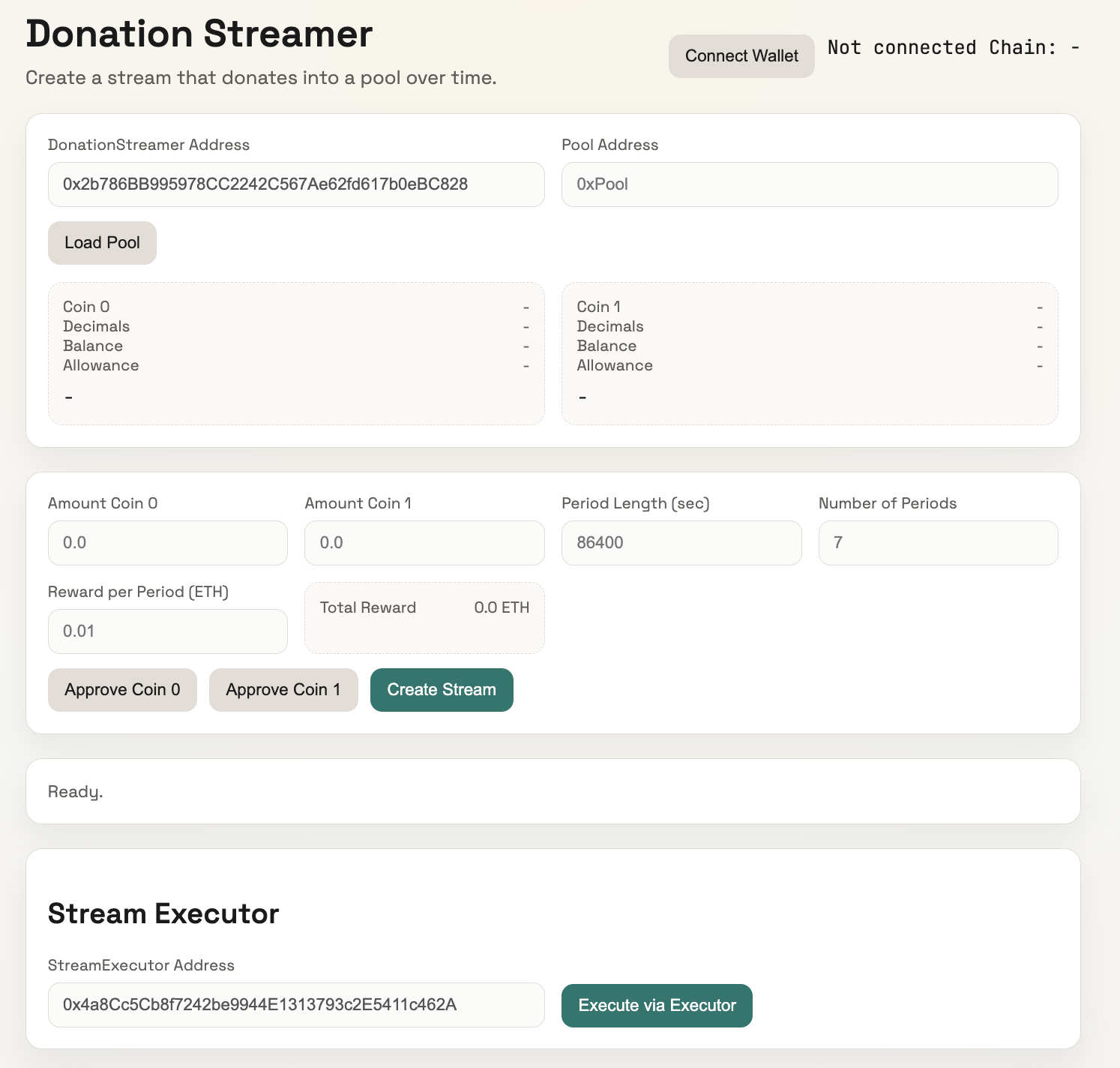 To manually trigger due refuels (or to earn the ETH bounties yourself), use the Stream Executor section at the bottom of the UI. The StreamExecutor Address is pre-filled — just click Execute via Executor to batch-execute all currently due streams and collect the bounties.
