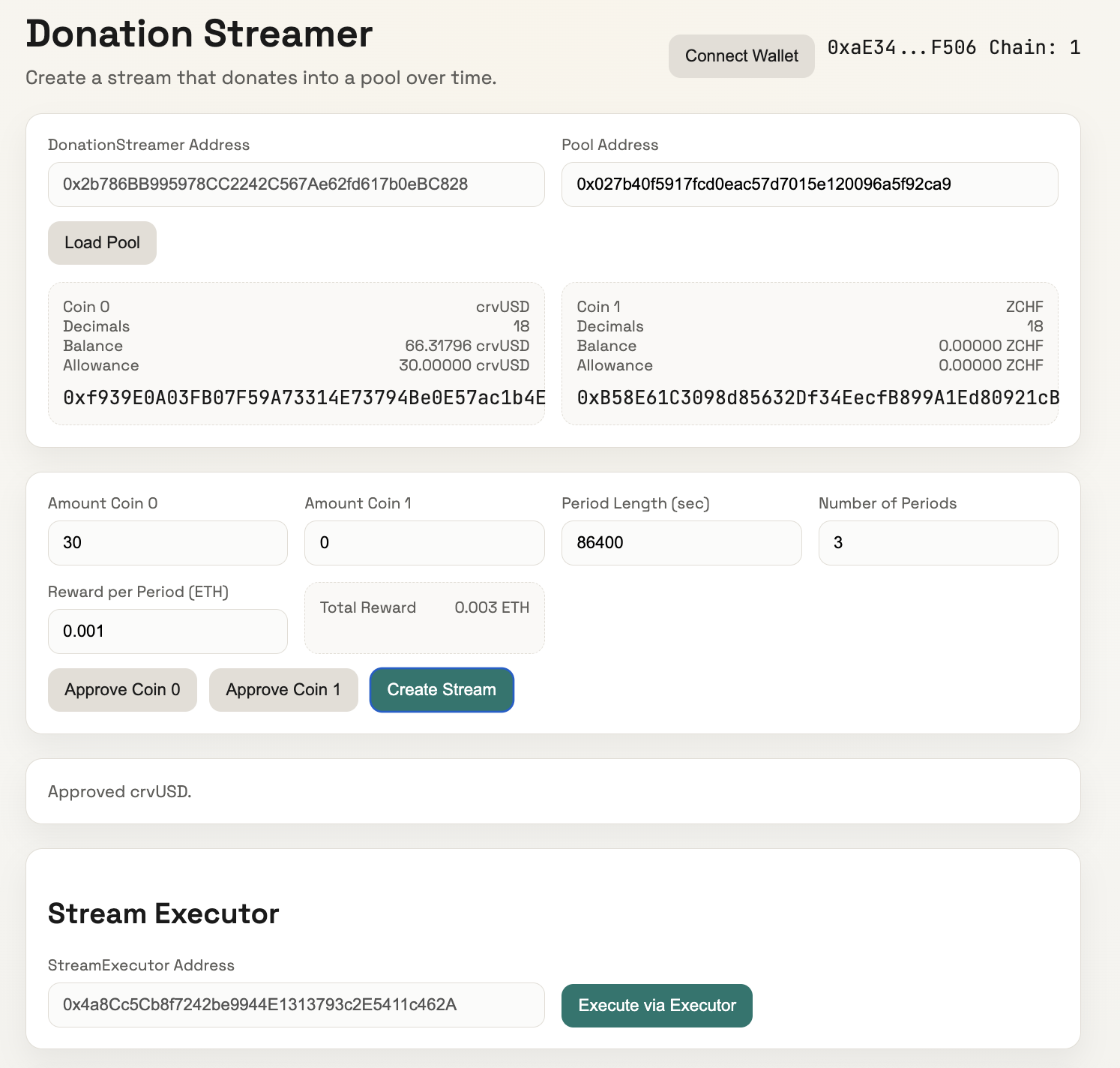 Example: The screenshot below shows a stream being configured to refuel a crvUSD/ZCHF pool with 30 crvUSD over 3 periods (once per day), with a bounty of 0.001 ETH per execution (0.003 ETH total).