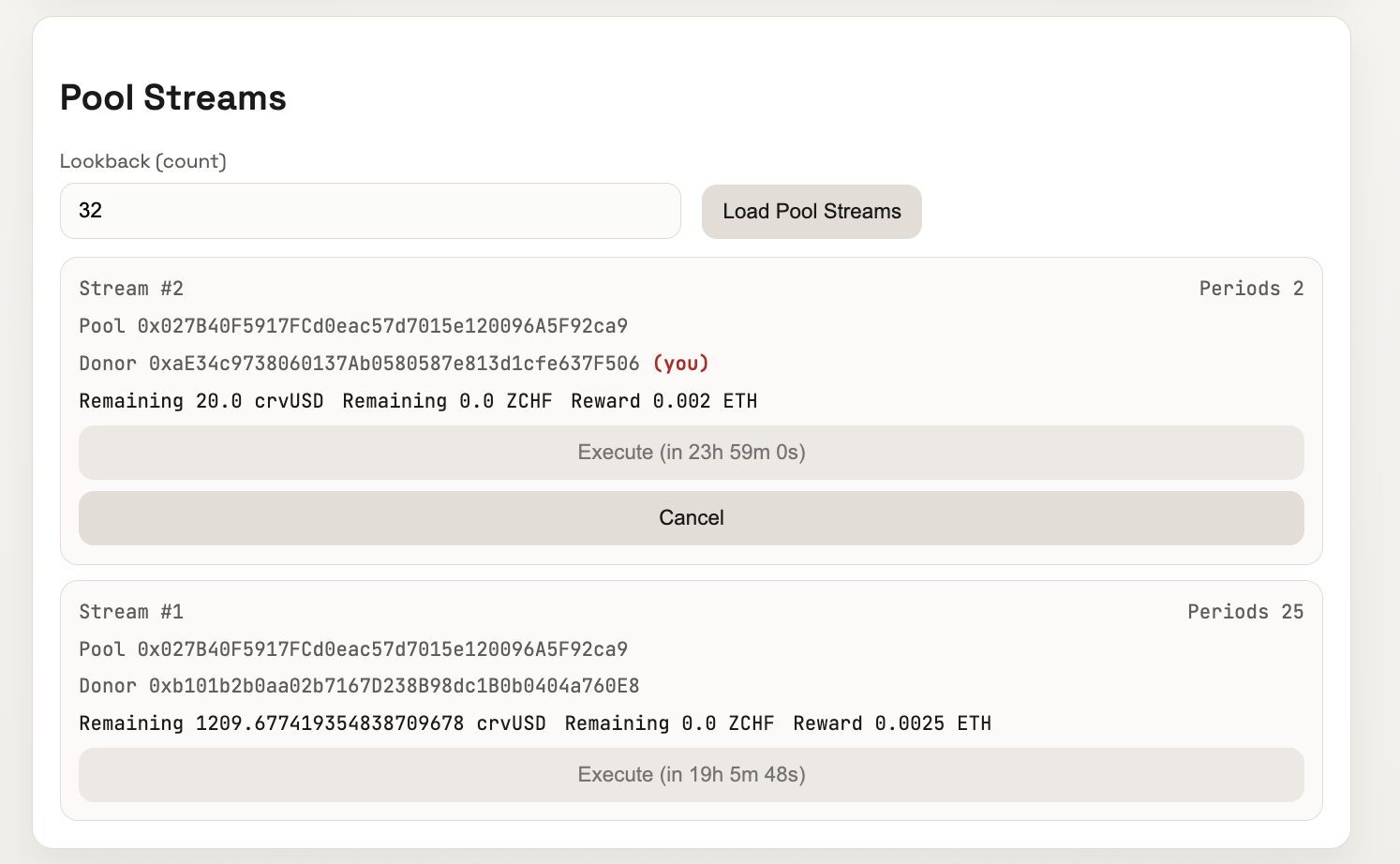 - Pool and donor addresses (your own streams are marked with (you))