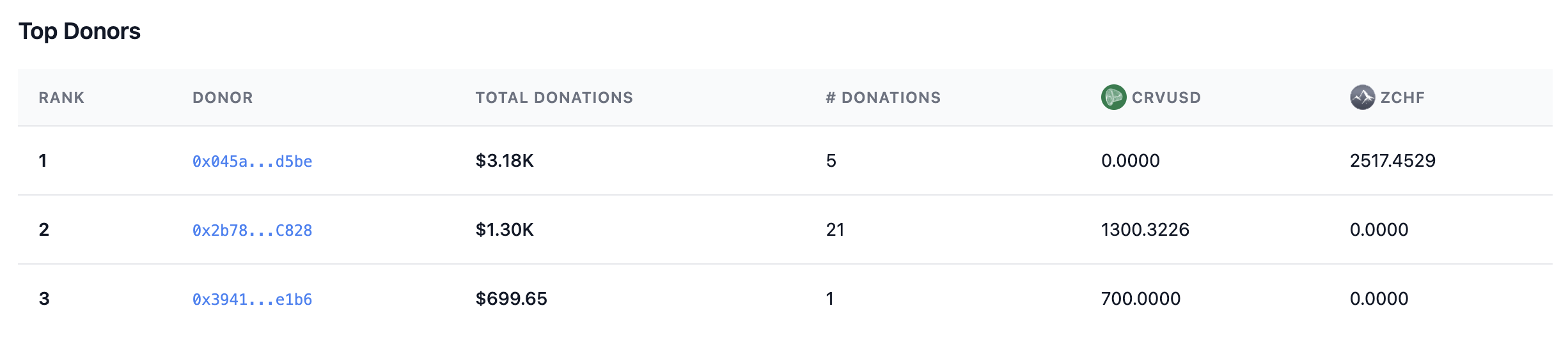 It also includes a Top Donors leaderboard showing each donor's total contribution in USD, number of donations, and token breakdown.