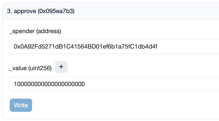 _spender: Enter0x0A92Fd5271dB1C41564BD01ef6b1a75fC1db4d4f, the bridge contract address. This address is the same for all tokens._value: Specify the amount in 1e18 format (for example, for 100 crvUSD, enter100000000000000000000).