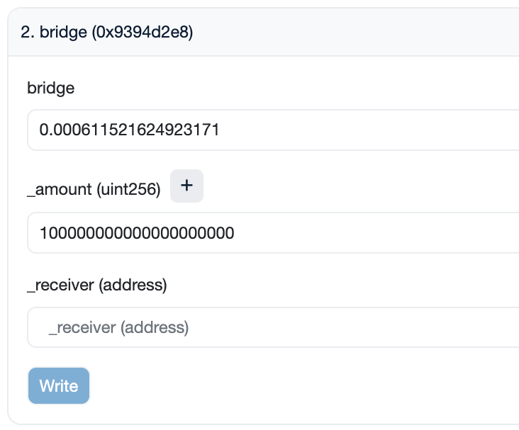 bridge: Enter the ETH amount quoted in Step 2. Ensure you enter the amount denominated in Ether (quoted amount / 1e18)._amount: Specify the amount of tokens in 1e18 format._receiver: Enter the wallet you wish to receive the tokens to.