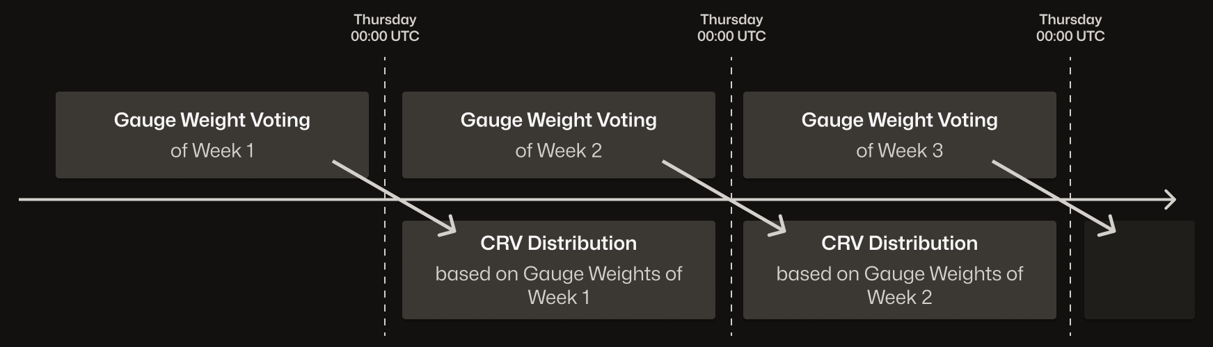Thursday 00:00 UTC: A snapshot is taken for this week's gauge weights. Pool A's gauge receives 10% of all veCRV votes. As a result, 10% of the weekly CRV inflation is allocated to Pool A's gauge and distributed to users who stake the LP token of that pool in the gauge throughout the week.