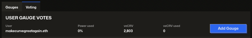 To vote for your first gauge, click the blue "Add Gauge" button and select the gauge you want to vote for. You can search by name or gauge address.