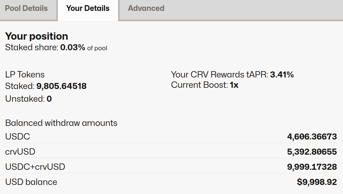 USDCandcrvUSD: We own a share of assets in the pool, so that means we have 4,606USDCand 5,392crvUSD. As users swap in this pool, these numbers will change, and the total should increase because of earned swap fees, becoming worth more than $10k in time. - Earning 3.41%