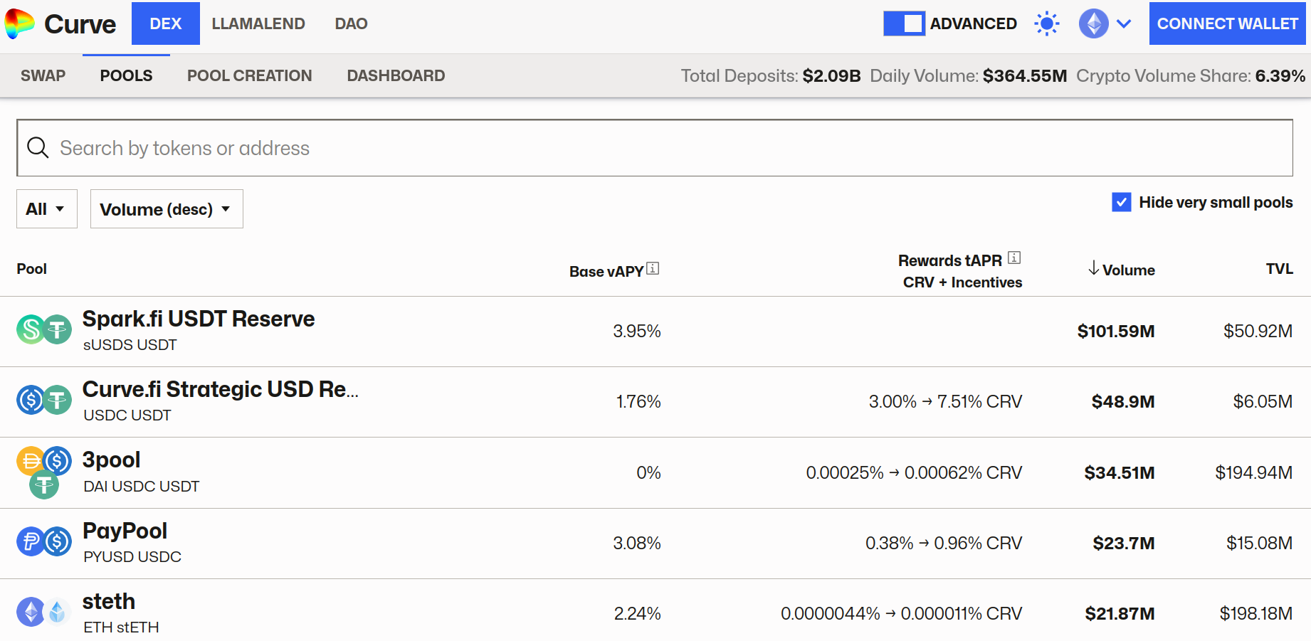 The pools overview above shows a list of all the available pools on that network, you can also search for an asset you would like to deposit, e.g., crvUSD, CRV, etc.