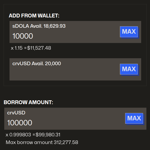 When creating a leveraged loan, users can choose to deposit either the collateral token or crvUSD (depositing crvUSD is only possible on newer markets).