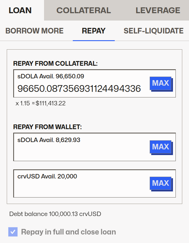When closing a leveraged loan by repaying with collateral, you will receive your collateral back in the borrowed token (crvUSD above), instead of your original collateral (sDOLA above).