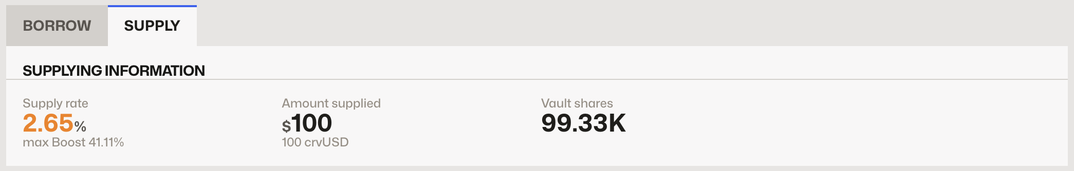 When hovering over the supply rate, a tooltip will appear explaining the composition of the total rate (base yield, CRV emissions, etc.).